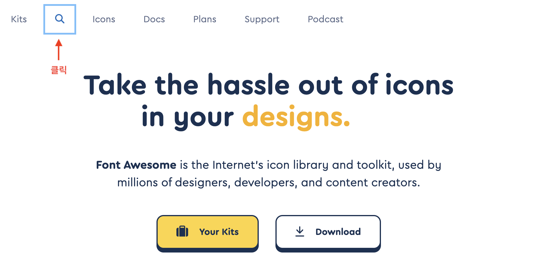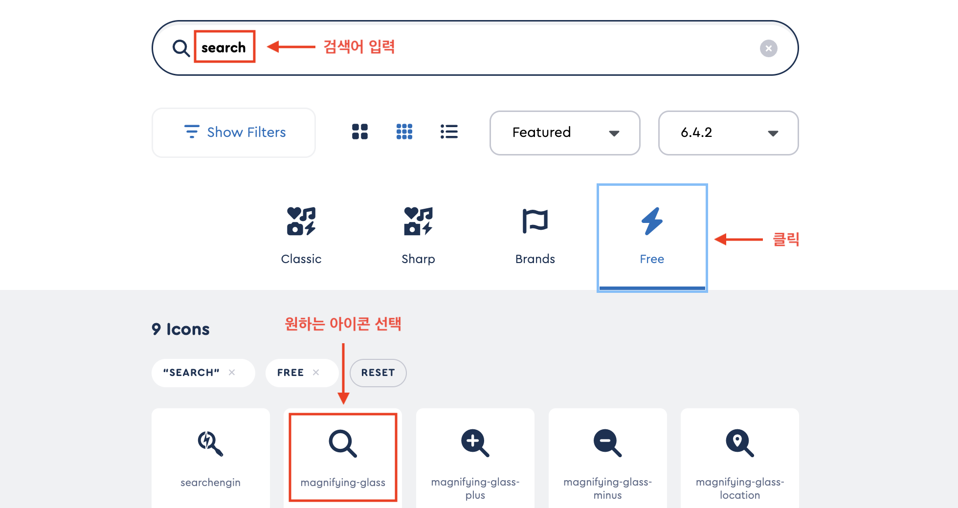 2. 폰트어썸 홈페이지(https://fontawesome.com/)에서 필요한 아이콘 찾기