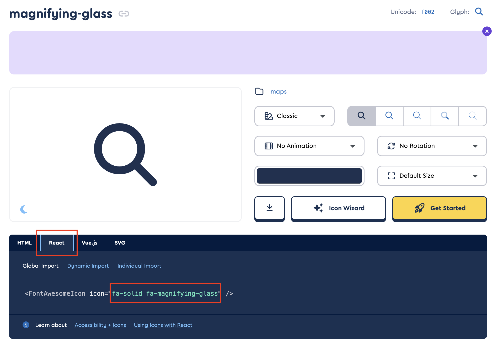 <FontAwesomeIcon icon="fa-solid fa-magnifying-glass" />
